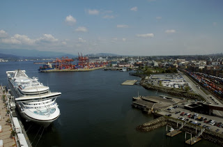 So far, it’s been wine and rhododendrons. (Well, no wine yet.) Sure, we had to get up at 3:30 a.m., but that and the excellent service of the (alas, bankrupt) Frontier Airlines got us to Vancouver even ahead of schedule, 10:30 a.m. PST. That gave us some time to explore some of our favorite places in Vancouver on our own. (Danielle’s parents are still somewhere over the Rockies as I write this in the late afternoon.) The one small problem has been that I appear to have thrown my back out a little bit yesterday. I’m sure I’m on the mend, but Danielle heroically did much luggage-carrying today. And there is a lot of luggage! The cruise ship (pictured here from our sixteenth-floor hotel room window