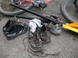 Next up was biking. Route choice was optional, but you had to get a bunch of control points, which more or less suggested a course. Also, there was going to be a mandatory four-CP orienteering section from one of the bike CPs. In other words, one had to take trail shoes along with bike shoes. (You always have to carry quite a bit of required and non-required stuff with you in adventure races.)