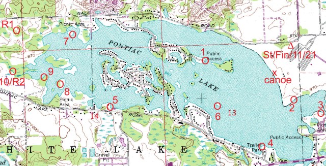 It turned out paddling was first, about five and a half miles of it, mostly on Pontiac Lake but with a brief jaunt up the Huron River, which wasn’t much of a river at that point: two kayaks had a hard time passing one another. As often in adventure races, the order in which one attempts the checkpoints is up to the racer. As the map above suggests, either a clockwise or counter-clockwise plan was the obvious thing to do. I, like most people, went counter-clockwise: 1, 7, 10, 9, 8, 5, 6, 4, 3, 2. Paddling on a lake is straightforward; the wind, the chop, and the rain were complications. Also, we learned during race briefing that portages were banned — a disqualifiable offense — but that there would be a waterway connection through the peninsula between 5 and 6 that the map doesn’t indicate, and that it would be OK. The only caveat, we were told, was that it was reeeaaallly low and that if we went into the drink, portage still wouldn’t be allowed.