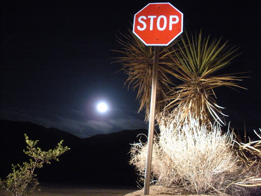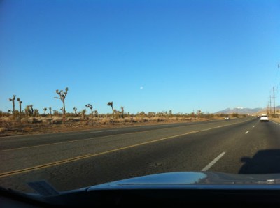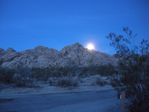 in a minute to those of you who don’t know what it means. First, a couple of words about the trip and J-Tree. I arrived at mid-afternoon, hopped into my rental, and headed east through L.A.’s permanent rush hour. It wasn’t as bad as it could be, all things considered, but I got to the Indian Cove campground where I had reserved two lots for Jess, A.J., and me at 8 p.m., right when the almost full moon rose from behind the otherworldly — or fake-looking — rocks. There is something surreal about moving from the urban sprawl of the metro L.A. area to the desert, especially as you pass by the weirdly haunting, enormous